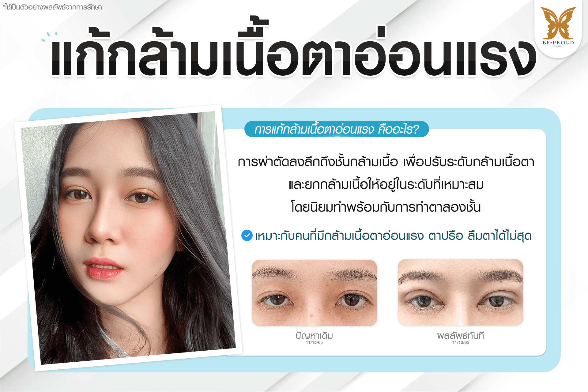 ทำตา2ชั้นที่ Beproud Clinic แ-ก้ไขกล้ามเนื้อตาอ่อนแรง ก่อนทำตาปรือ ไม่สดใส ดูง่วงนอนตลอดเวลาเลยค่ะ หลังทำออกมาแล้วสวยถูกใจ แผลไม่ใหญ่ คุณหมอและพนักงานน่ารักมาก